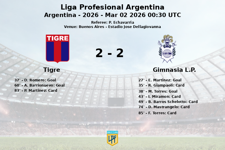 Buenos Aires – En un partido cargado de intensidad y alternativas, Tigre y Gimnasia L.P. igualaron en el Estadio Jose Dellagiovanna, en un encuentro correspondiente a la Liga Profesional Argentina. El encuentro, disputado bajo el arbitraje de P. Echavarria, dejó una sensación agridulce para ambos equipos.