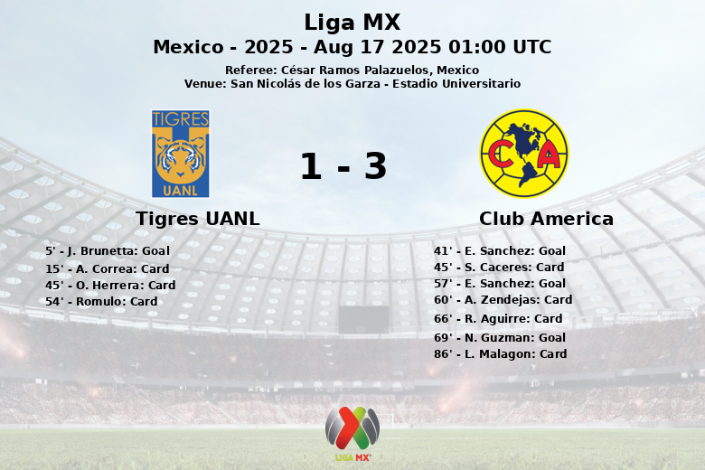 Tigres tomó la delantera temprano en el minuto 5 con un gol de J. Brunetta, asistido por D. Lainez, encendiendo las esperanzas de la afición local. Sin embargo, el Club América respondió con contundencia. E. Sanchez empató el marcador en el minuto 41 con una asistencia de C. Borja, llevando el partido al descanso con un empate a uno.