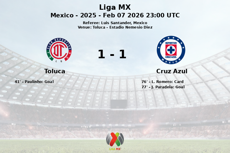 Toluca, México – En un partido correspondiente a la quinta jornada del Clausura 2025 de la Liga MX, Toluca y Cruz Azul empataron en un encuentro que se caracterizó por su intensidad y disputa en el mediocampo. El partido, celebrado en el Estadio Nemesio Diez y arbitrado por Luis Santander, vio a los Diablos Rojos tomar la delantera en el minuto 41 gracias a un gol de Paulinho, asistido por J. Gallardo.