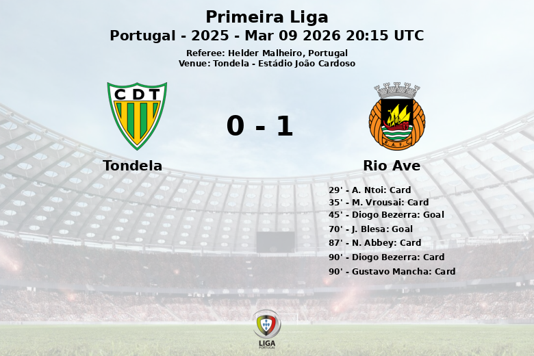Tondela, Portugal – En un encuentro de la Primeira Liga disputado en el Estádio João Cardoso, el Rio Ave se impuso al Tondela con un marcador final de dos a cero. El partido, arbitrado por Helder Malheiro, fue parte de la jornada 25 de la temporada regular.
