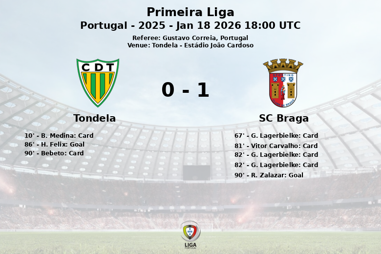 El Tondela tuvo la oportunidad de adelantarse en el marcador al minuto 86, pero H. Felix falló un penal. La tensión se mantuvo hasta el final, y en el minuto 90, R. Zalazar convirtió un penal para el SC Braga, igualando el marcador. Bebeto del Tondela recibió una tarjeta amarilla en el mismo minuto. A pesar de la superioridad en la posesión y los 11 tiros realizados, el SC Braga solo logró concretar un penal, mientras que el Tondela aprovechó al máximo sus oportunidades a pesar de tener menos tiros a puerta. El partido finalizó con un resultado que deja un sabor amargo para ambos equipos.
