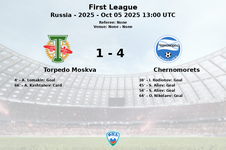 Sochi, Rusia – En un encuentro disputado en la First League rusa, el Chernomorets demostró su superioridad al vencer al Torpedo Moskva con un marcador contundente. El partido, correspondiente a la jornada 13 de la temporada regular, fue un festival de goles que deleitó a los aficionados.