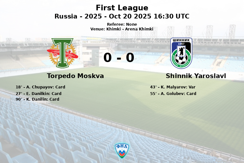 La primera mitad fue marcada por la agresividad del Torpedo Moskva, que vio a A. Chupayov y E. Danilkin recibir tarjetas amarillas. El Shinnik Yaroslavl también sufrió un revés cuando un gol de K. Malyarov fue anulado por el VAR debido a un fuera de juego al filo del descanso.