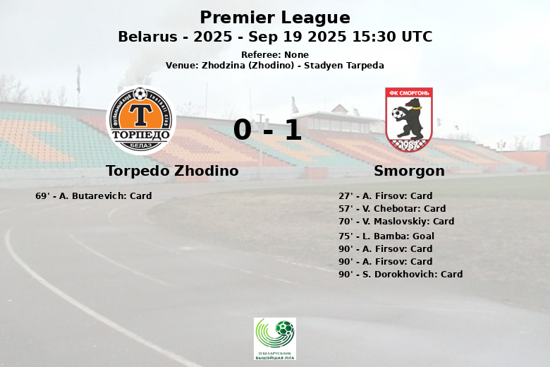 Zhodzina (Zhodino), Bielorrusia – En un encuentro disputado en el Stadyen Tarpeda, Smorgon logró una valiosa victoria en su visita a Torpedo Zhodino en la jornada 22 de la Premier League bielorrusa. El partido, que tuvo lugar el 19 de septiembre de 2025, estuvo marcado por la intensidad y la alta carga de tarjetas.