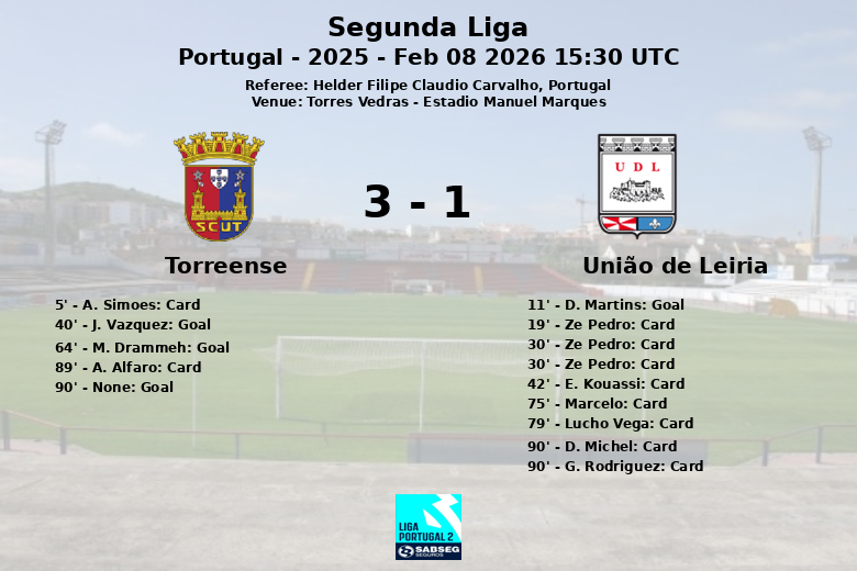 El União de Leiria se adelantó temprano en el minuto 11 con un gol de D. Martins. Sin embargo, el Torreense respondió en la primera mitad, con J. Vazquez anotando al minuto 40, igualando el encuentro.