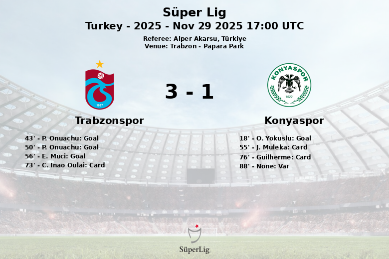 El partido comenzó con un autogol desafortunado de O. Yokuslu al minuto 18, dando la ventaja inicial al Konyaspor. Sin embargo, el Trabzonspor respondió con contundencia. P. Onuachu igualó el marcador al minuto 43 mediante un penalti bien ejecutado y luego amplió la ventaja al minuto 50 con un gol de jugada, asistido por M. Eskihellac. El Trabzonspor sentenció el partido al minuto 56 con un tanto de E. Muci.
