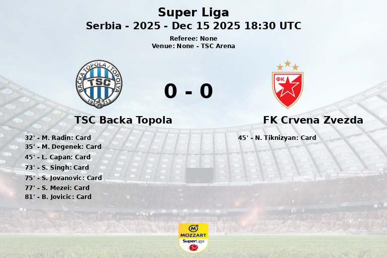 El partido se vio marcado por la gran cantidad de tarjetas amarillas mostradas al TSC Backa Topola, acumulando un total de 7, mientras que el FK Crvena Zvezda solo recibió 1. El TSC cometió un total de 17 faltas, en comparación con las 7 cometidas por el equipo de Belgrado. A pesar del dominio en la posesión y los tiros, el Crvena Zvezda no logró reflejar esta superioridad en el marcador. El encuentro finalizó con un marcador de empate a cero goles.