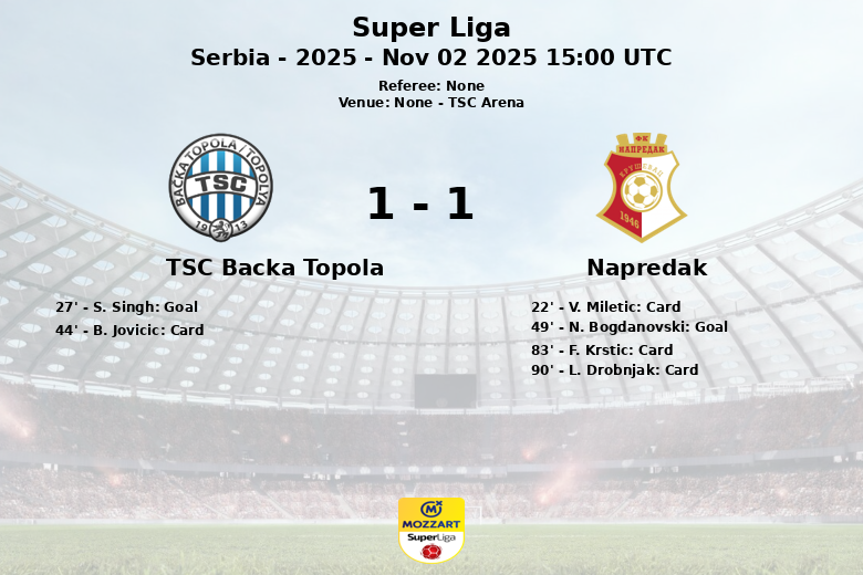 El TSC Backa Topola se adelantó en el minuto 27 gracias a un gol de S. Singh, asistido por B. Jovicic. Sin embargo, el Napredak respondió en el minuto 49 con un gol de N. Bogdanovski, tras una asistencia de N. Bastajic, igualando el encuentro. El partido estuvo marcado por la intensidad y la lucha en el mediocampo, lo que se reflejó en un total de 28 faltas cometidas por ambos equipos y varias tarjetas amarillas mostradas a jugadores de ambos lados. Al final, la superioridad en la posesión no se tradujo en una victoria para el TSC Backa Topola, y el Napredak se llevó un valioso punto a casa.