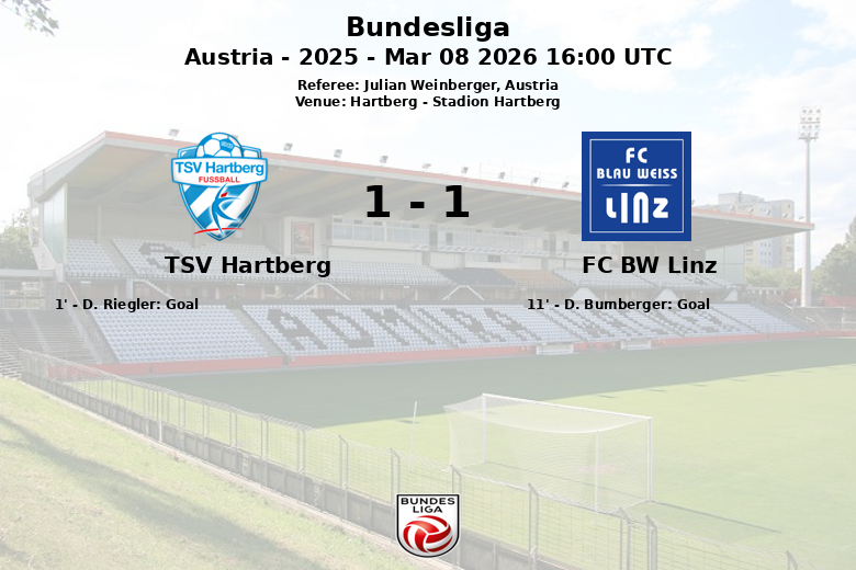 El TSV Hartberg se adelantó temprano gracias a un gol en propia puerta de D. Riegler en el primer minuto. Sin embargo, el FC BW Linz respondió con rapidez, con D. Bumberger anotando en el minuto 11, asistido por S. Seidl, igualando el marcador.
