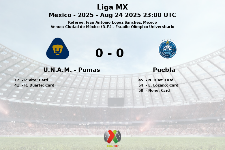 El árbitro, Ivan Antonio Lopez Sanchez, tuvo una noche ocupada, mostrando dos tarjetas amarillas a jugadores de cada equipo. Por Pumas, P. Vite (17′) y R. Duarte (41′) fueron amonestados, mientras que por Puebla, N. Diaz (45′) y E. Lozano (54′) vieron la tarjeta. El partido se caracterizó por un alto número de faltas, con 16 cometidas por Pumas y 18 por Puebla, reflejando la intensidad con la que ambos equipos disputaron cada balón. Ambos equipos se repartieron también el número de tiros de esquina con 4 para cada uno.