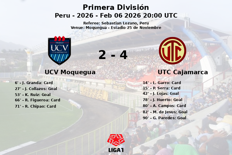 Sin embargo, UTC Cajamarca no se rindió y mostró una notable capacidad de reacción en la segunda mitad. K. Ruiz anotó para UCV Moquegua al minuto 53. J. Huerto descontó al minuto 78, seguido por un penal convertido por M. de Jesus al minuto 82, igualando el marcador. El gol de la victoria llegó en el tiempo de descuento, cuando G. Paredes selló la remontada para UTC Cajamarca.