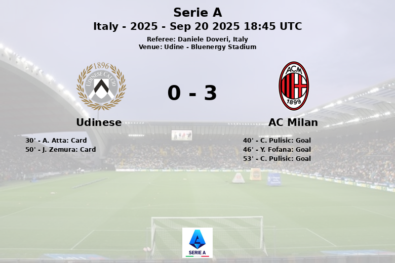 El Udinese, a pesar de jugar en casa, luchó por mantener el ritmo del partido. A. Atta recibió una tarjeta amarilla en el minuto 30, seguido por J. Zemura en el minuto 50. El equipo local tuvo un 39% de posesión y 9 tiros, pero solo 4 fueron a puerta. Por su parte, el AC Milan acumuló 13 tiros, con 6 dirigidos al arco. El partido se caracterizó por un juego físico, con 9 faltas cometidas por el Udinese y 7 por el AC Milan.