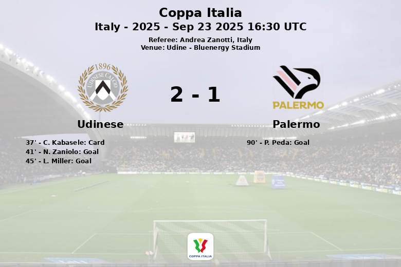 Udine, Italia – En un partido emocionante disputado en el Bluenergy Stadium, el Udinese logró vencer al Palermo con un marcador de 2 a 1, en un encuentro correspondiente a la segunda ronda de la Coppa Italia.