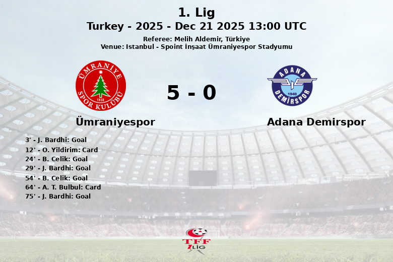 Estambul, Turquía – En un encuentro disputado en el Spoi̇nt İnşaat Ümrani̇yespor Stadyumu, el Ümraniyespor demostró una clara superioridad sobre el Adana Demirspor, sellando una contundente victoria. Desde el inicio, el equipo local impuso su ritmo, abriendo el marcador a los 3 minutos con un gol de J. Bardhi, asistido por T. Ozdemir. La presión continuó, y al minuto 24, B. Celik amplió la ventaja gracias a una asistencia de S. Goksu.