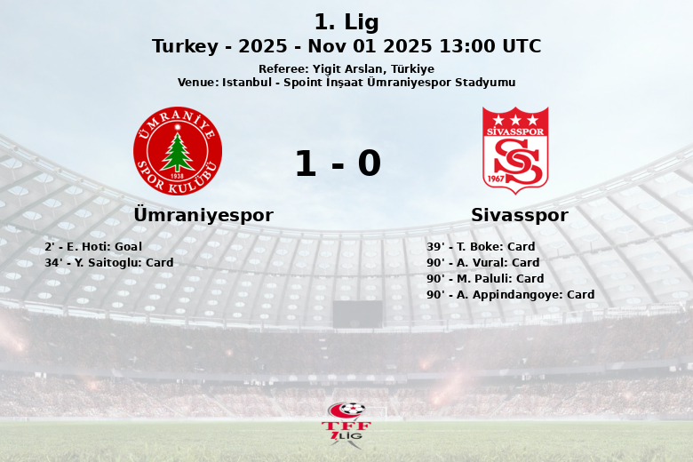 El Ümraniyespor comenzó con fuerza, abriendo el marcador a los 2 minutos gracias a un gol de E. Hoti, asistido por T. Ozdemir. A pesar de tener menor posesión (39% frente al 61% del Sivasspor), el equipo local supo aprovechar sus oportunidades.
