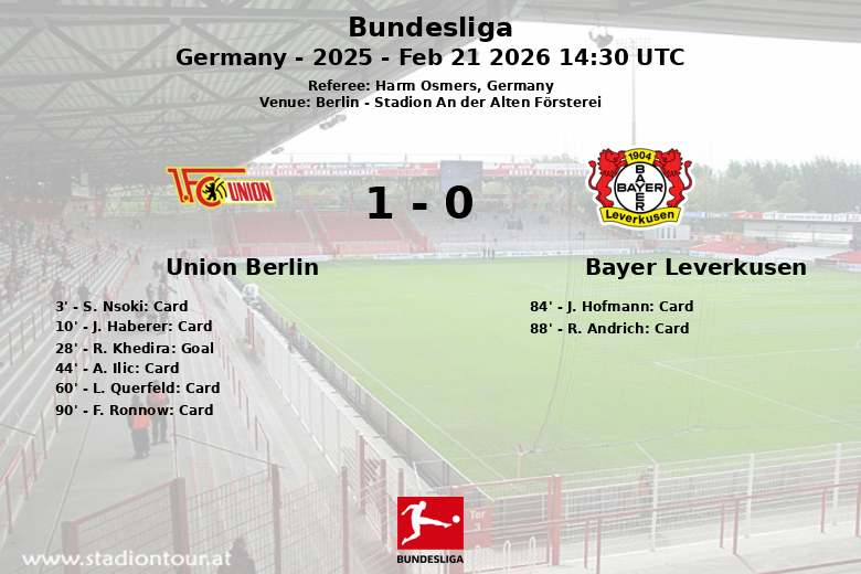 Berlin, Alemania – En un encuentro cargado de tensión y con un alto número de tarjetas amarillas, el Union Berlin logró vencer al Bayer Leverkusen en el Stadion An der Alten Försterei. El partido, correspondiente a la jornada 23 de la Bundesliga, vio al Union Berlin capitalizar su solidez defensiva y un gol clave de R. Khedira en el minuto 28, tras una asistencia de A. Kemlein, para asegurar los tres puntos.