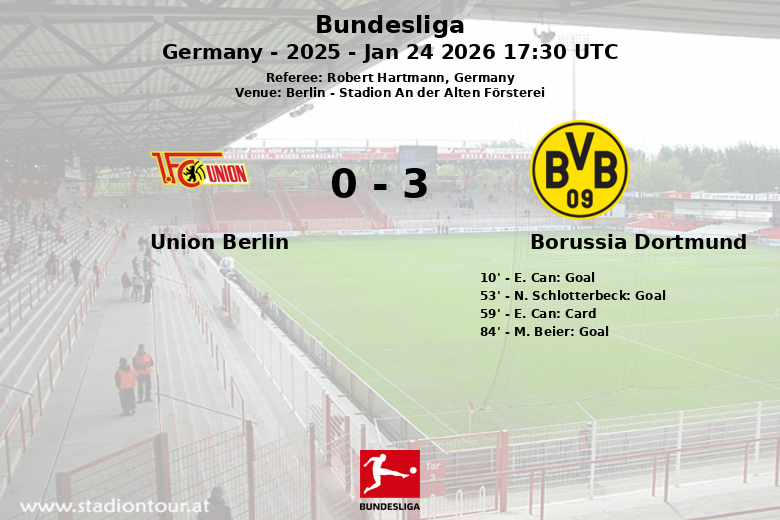 El encuentro comenzó con un gol de penalti de E. Can para el Borussia Dortmund al minuto 10. La ventaja se amplió al inicio de la segunda mitad, al minuto 53, con un gol de N. Schlotterbeck, tras una asistencia de J. Ryerson. El Union Berlin intentó reaccionar, pero se encontró con una defensa sólida del Dortmund. El partido tuvo momentos de tensión, reflejados en la tarjeta amarilla mostrada a E. Can al minuto 59. Finalmente, M. Beier sentenció el partido al minuto 84 con un gol, asistido por J. Bellingham, consolidando la victoria para el Borussia Dortmund. El partido se caracterizó por un alto número de faltas, 15 del Dortmund y 10 del Union Berlin, y un total de 14 tiros del Dortmund frente a 10 del equipo local.
