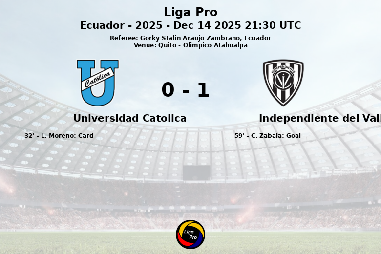 Quito, Ecuador – En un partido disputado en el estadio Olímpico Atahualpa, Independiente del Valle venció a Universidad Católica en un encuentro correspondiente a la novena ronda del Championship Group de la Liga Pro 2025. El único gol del partido fue obra de C. Zabala al minuto 59, tras una jugada sin asistencia aparente.