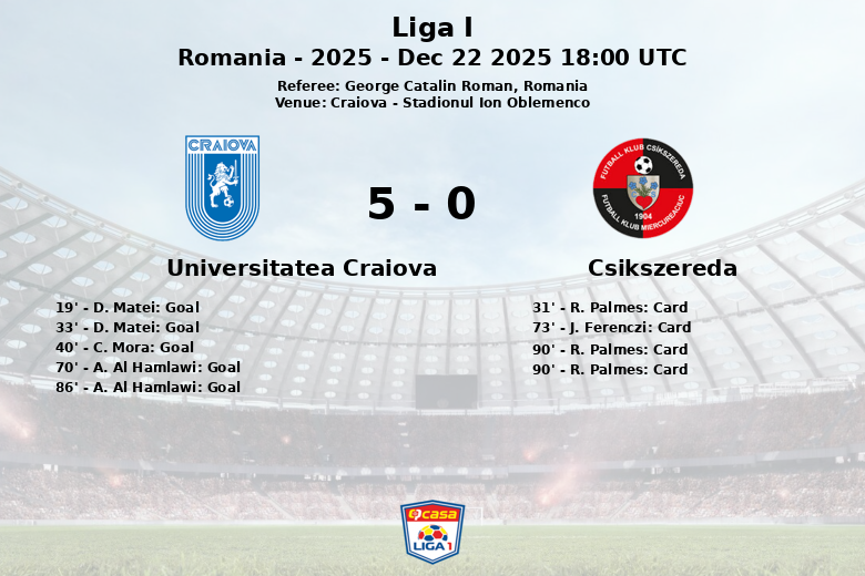 En la segunda mitad, la presión del Craiova no disminuyó. A. Al Hamlawi anotó en el minuto 70, con pase de M. Etim, y repitió en el minuto 86 asistido por C. Mora, sellando la goleada. El Csikszereda, por su parte, mostró poca capacidad ofensiva, registrando solo dos disparos, uno de ellos a puerta, y sufriendo para mantener la posesión del balón. La frustración se evidenció con las tarjetas amarillas a R. Palmes y J. Ferenczi, culminando con la expulsión de Palmes por doble amonestación en el minuto 90. El encuentro fue dirigido por el árbitro George Catalin Roman.