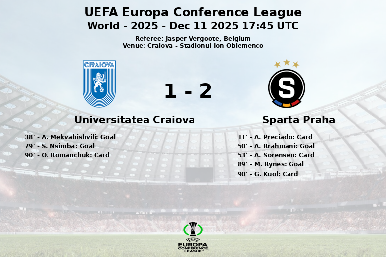 Craiova, Rumania – El Sparta Praha se llevó una valiosa victoria del Stadionul Ion Oblemenco en un emocionante partido de la UEFA Europa Conference League. El encuentro, disputado bajo la atenta mirada del árbitro belga Jasper Vergoote, vio al Sparta Praha imponerse con un juego ofensivo, aunque no sin dificultades frente a un combativo Universitatea Craiova.