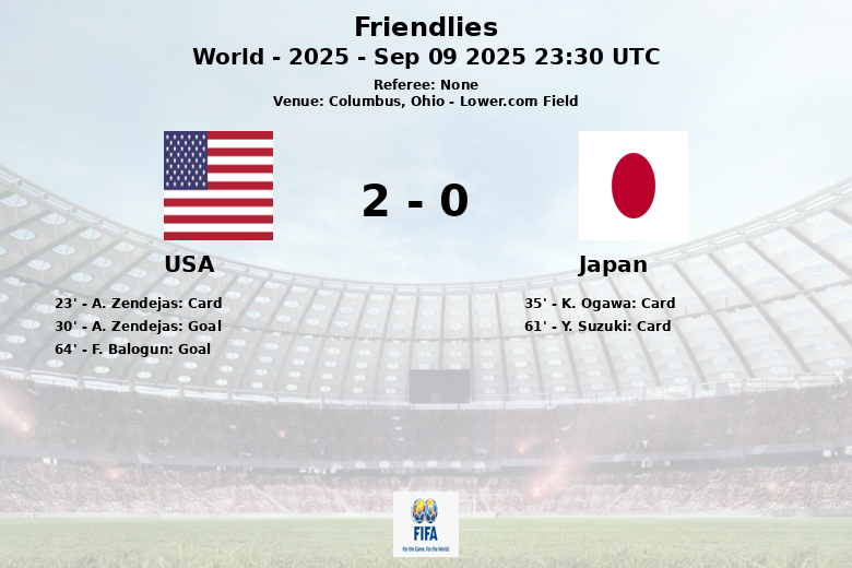 El marcador se abrió en el minuto 30 gracias a un gol de A. Zendejas, tras una asistencia de M. Arfsten. La primera mitad también estuvo marcada por una tarjeta amarilla para Zendejas en el minuto 23 y otra para el japonés K. Ogawa en el minuto 35. En la segunda mitad, F. Balogun amplió la ventaja para Estados Unidos en el minuto 64, con asistencia de C. Pulisic, sellando así la victoria.
