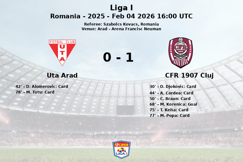 Arad, Rumania – El CFR 1907 Cluj se llevó una valiosa victoria como visitante ante el Uta Arad en un encuentro disputado en el Arena Francisc Neuman. El único gol del partido, anotado por M. Korenica al minuto 68 con asistencia de A. Aliev, fue suficiente para sellar los tres puntos para el Cluj.