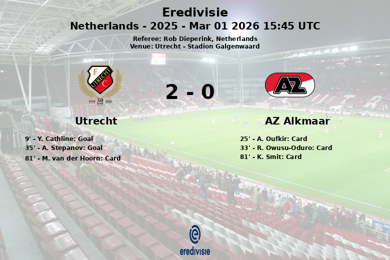 Utrecht se impuso en casa al AZ Alkmaar en un partido disputado en el Stadion Galgenwaard. El encuentro, correspondiente a la jornada 25 de la Eredivisie 2025, se caracterizó por la intensidad y las numerosas tarjetas amarillas mostradas por el árbitro Rob Dieperink.