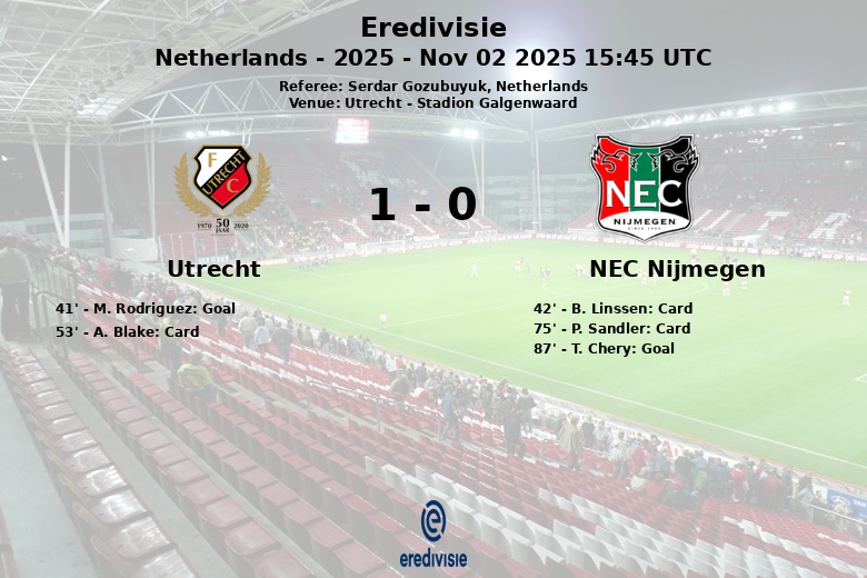El único gol del partido llegó en el minuto 41, cuando M. Rodriguez, asistido por A. Blake, logró batir al portero del NEC Nijmegen. Este tanto le dio la ventaja al Utrecht, que supo defenderla con uñas y dientes durante el resto del encuentro.