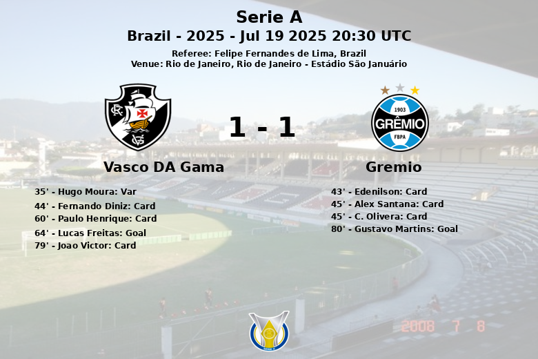 El encuentro estuvo marcado por la anulación de un gol a Vasco da Gama en el minuto 35 por una falta previa, según la revisión del VAR. El árbitro Felipe Fernandes de Lima también se vio obligado a mostrar varias tarjetas amarillas, con dos para Vasco da Gama y tres para Gremio, reflejando la intensidad del juego.
