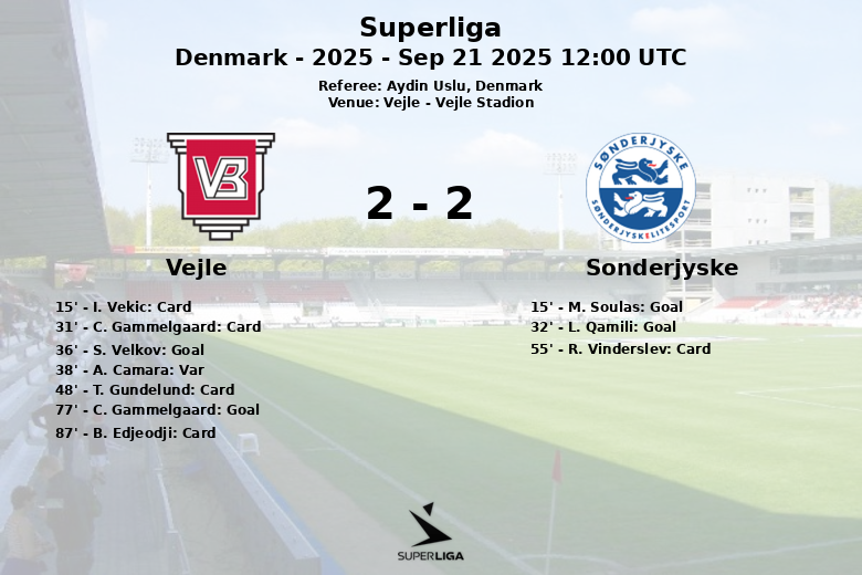 La segunda mitad vio un juego más táctico y con menos ocasiones claras. El Vejle logró igualar el marcador al minuto 77 gracias a un penal convertido por C. Gammelgaard. A pesar de la presión final del Vejle, el Sonderjyske supo mantener la ventaja y se llevó la victoria.