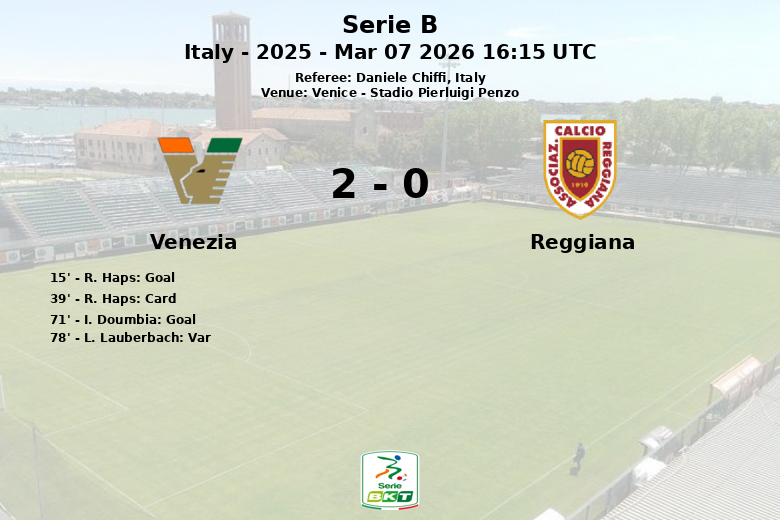 R. Haps abrió el marcador en el minuto 15 con un gol tras una asistencia de I. Doumbia. A pesar del dominio de balón, el Venezia se vio ligeramente frenado por la táctica defensiva del Reggiana. Haps recibió una tarjeta amarilla en el minuto 39.