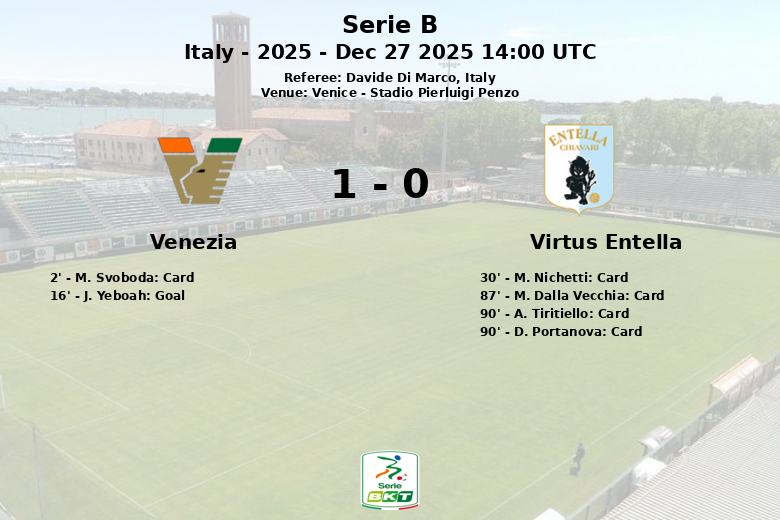 El partido se caracterizó por un juego físico, con un total de 34 faltas cometidas entre ambos equipos. El árbitro Davide Di Marco amonestó a cuatro jugadores del Virtus Entella y a uno del Venezia. A pesar de los cinco tiros fuera del arco y los 4 tiros a puerta, el Venezia no pudo concretar más goles, pero la solidez defensiva les permitió mantener la ventaja hasta el final. El Virtus Entella, por su parte, intentó generar peligro con 8 tiros totales y 5 corners, pero no logró batir la portería local.
