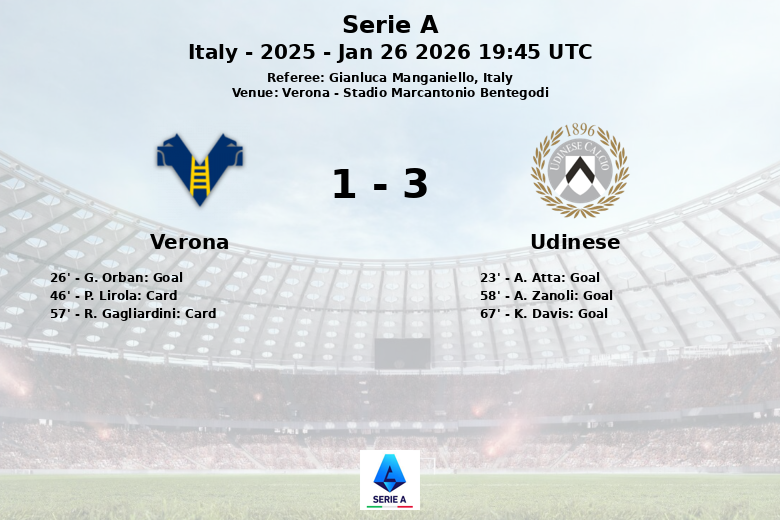 El Udinese abrió el marcador en el minuto 23 gracias a un gol de A. Atta, con asistencia de J. Zemura. La alegría de los visitantes duró poco, ya que G. Orban empató el partido para el Verona en el minuto 26, asistido por A. Sarr. La primera mitad finalizó con un empate.