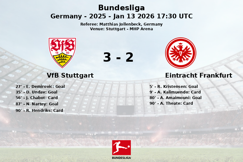 En la segunda mitad, el Eintracht Frankfurt luchó por volver al partido y A. Amaimouni igualó las cosas al minuto 80, gracias a una asistencia de M. Dahoud. Sin embargo, N. Nartey del VfB Stuttgart devolvió la ventaja a su equipo al minuto 87, con asistencia de J. Vagnoman. Cuando parecía que la victoria se quedaba en casa, el Eintracht Frankfurt logró rescatar un punto valioso.