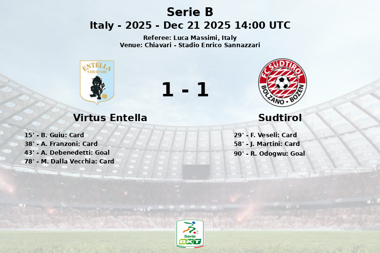 Chiavari, Italia – En un encuentro disputado en el Stadio Enrico Sannazzari, Virtus Entella y Sudtirol igualaron fuerzas en un partido que terminó con un marcador de 1 a 1. El partido, correspondiente a la jornada 17 de la Serie B, estuvo marcado por un juego físico y táctico, reflejado en la gran cantidad de faltas cometidas por ambos equipos, 17 por bando.