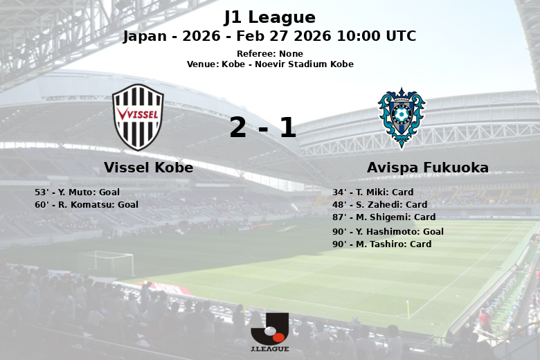 En la segunda mitad, Y. Muto abrió el marcador para el Vissel Kobe al minuto 53, con asistencia de R. Komatsu. Poco después, al minuto 60, R. Komatsu amplió la ventaja para los locales, esta vez con asistencia de D. Sasaki. El Avispa Fukuoka, a pesar de jugar con un hombre menos, logró descontar al minuto 90 con un gol de Y. Hashimoto.