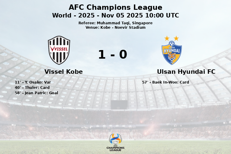 Kobe, Japón – En un encuentro correspondiente a la Liga de Campeones de la AFC, el Vissel Kobe se impuso al Ulsan Hyundai FC en el Noevir Stadium en un partido dominado en posesión por los locales (64%). El encuentro, arbitrado por Muhammad Taqi, estuvo marcado por la alta intensidad y la disputa en el mediocampo.