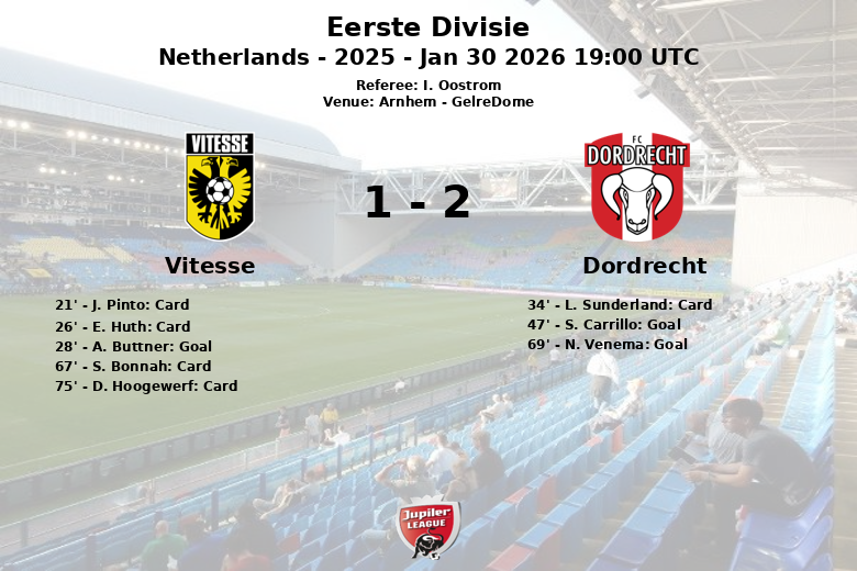 Arnhem, Países Bajos – En un encuentro disputado en el GelreDome, el Dordrecht sorprendió al Vitesse con una victoria por 2 a 1 en la jornada 25 de la Eerste Divisie. El partido, arbitrado por I. Oostrom, se caracterizó por un juego físico, reflejado en las numerosas faltas y tarjetas amarillas.