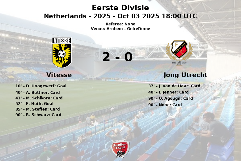 Arnhem, Países Bajos – Vitesse superó a Jong Utrecht en un encuentro disputado en el GelreDome, correspondiente a la décima jornada de la Eerste Divisie. El partido, marcado por un alto número de tarjetas amarillas, finalizó con un marcador de 2 a 0 a favor del equipo local.