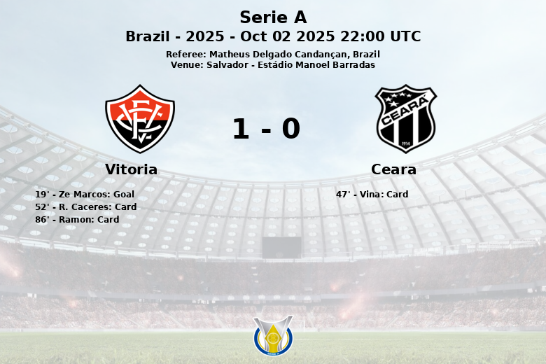 El partido estuvo marcado por una alta intensidad, reflejada en las 14 faltas cometidas por Vitoria y las 15 por Ceará. El árbitro, Matheus Delgado Candançan, mostró dos tarjetas amarillas al Vitoria (R. Caceres y Ramon) y una a Ceará (Vina). Vitoria generó 6 tiros de esquina frente a los 3 de Ceará, mostrando cierta peligrosidad en el área rival. El partido terminó con un marcador de uno a cero favorable a Vitoria, que suma tres puntos importantes en la temporada.