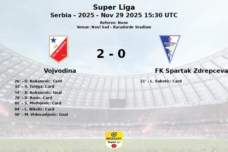Novi Sad, Serbia – El Vojvodina logró una importante victoria en casa ante el FK Spartak Zdrepceva KRV en un partido de la Super Liga serbia que se definió en la segunda mitad. El encuentro, disputado en el Karadorde Stadium, estuvo marcado por la intensidad y las numerosas tarjetas amarillas.