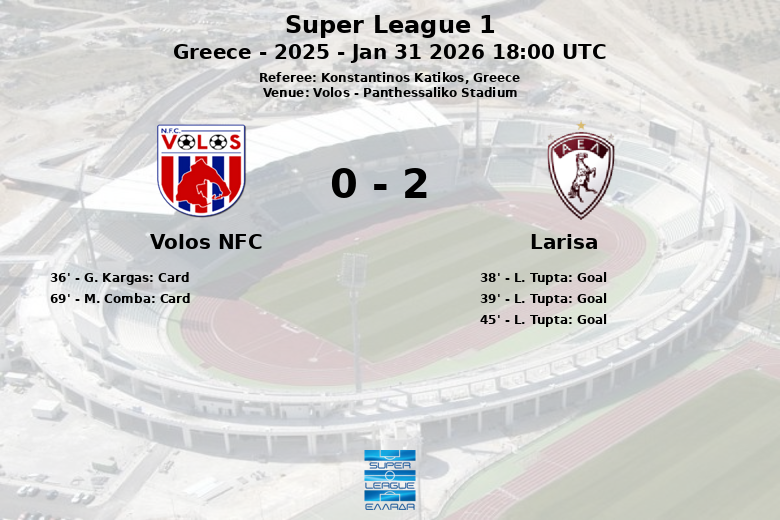 El Volos, a pesar de los esfuerzos y de generar 12 tiros (aunque solo 2 a puerta), no pudo superar la sólida defensa del Larisa. Las cinco sustituciones del Volos NFC no lograron cambiar el rumbo del partido. El Larisa, con un 45% de posesión, fue más eficaz de cara a portería, logrando 17 tiros, 6 de ellos a puerta. Un partido intenso con un total de 35 faltas entre ambos equipos.