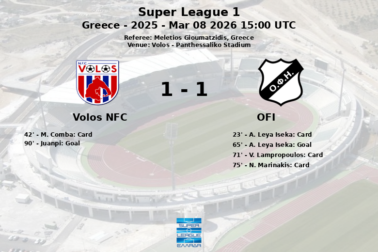 El OFI se adelantó en el marcador en el minuto 65 gracias a un gol de A. Leya Iseka. El Volos NFC buscó insistentemente el empate y lo encontró en el último minuto del tiempo reglamentario, con un gol de penalti convertido por Juanpi en el minuto 90. El partido también sumó tarjetas amarillas para V. Lampropoulos y N. Marinakis, ambos del OFI, en los minutos 71 y 75 respectivamente. El Volos NFC obtuvo 9 tiros de esquina y el OFI 4.
