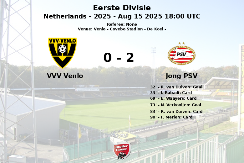 El marcador se abrió en el minuto 32, cuando R. van Duiven convirtió un penal a favor del Jong PSV. El primer tiempo también vio una tarjeta amarilla para I. Babadi del Jong PSV. Tras el descanso, el VVV Venlo intentó reaccionar, pero la defensa del Jong PSV se mantuvo sólida. En el minuto 73, N. Verkooijen amplió la ventaja para el Jong PSV con un gol tras una jugada elaborada.