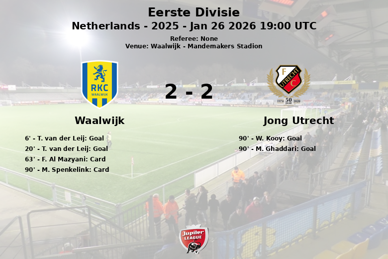La insistencia de Jong Utrecht finalmente dio sus frutos en los últimos minutos. W. Kooy anotó en el minuto 90, y M. Ghaddari empató el marcador también en el minuto 90. El partido, que se jugó con intensidad, dejó ver 11 faltas de Waalwijk contra 6 de Jong Utrecht. Los locales recibieron dos tarjetas amarillas, para F. Al Mazyani al minuto 63 y M. Spenkelink al minuto 90. A pesar de tener menos tiros a puerta (3 contra 9), Waalwijk se vio en la necesidad de defenderse contra un Jong Utrecht que insistió en los últimos minutos. Jong Utrecht dominó los corners, con 8 contra 1 de Waalwijk, evidenciando su presión constante en el área rival.