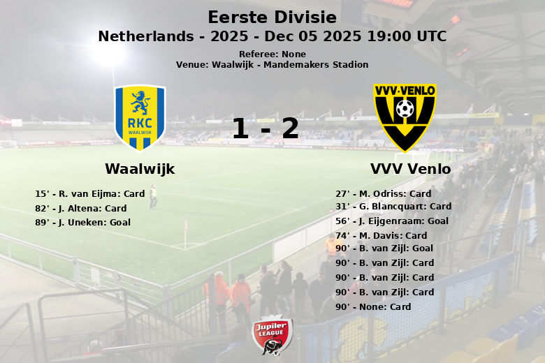 El VVV Venlo abrió el marcador en el minuto 56 con un gol de J. Eijgenraam, asistido por M. Odriss. A pesar de la insistencia del Waalwijk, con 24 tiros en total, solo 6 lograron dirigirse a la portería rival. El empate llegó en el minuto 89 gracias a J. Uneken del Waalwijk, sin asistencia.