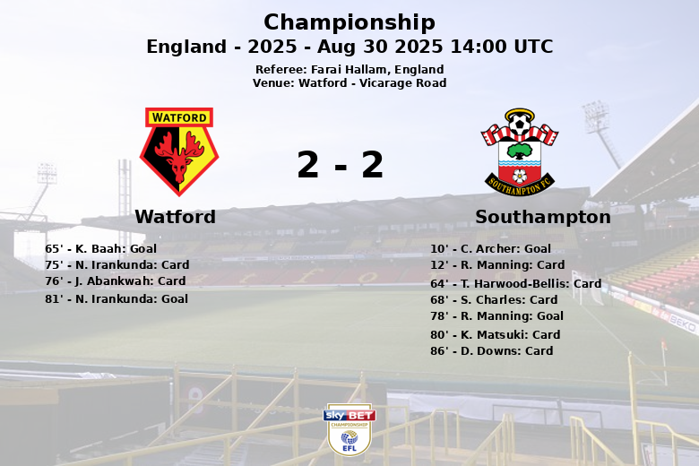 Watford vs Southampton Aug 30 2025 14:00 UTC