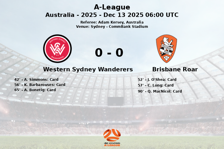 Sydney, Australia – En un encuentro disputado en el CommBank Stadium, el Western Sydney Wanderers y el Brisbane Roar protagonizaron un partido marcado por la intensidad y la lucha en el mediocampo. El árbitro Adam Kersey tuvo una tarde ajetreada, repartiendo un total de seis tarjetas amarillas, tres para cada equipo.