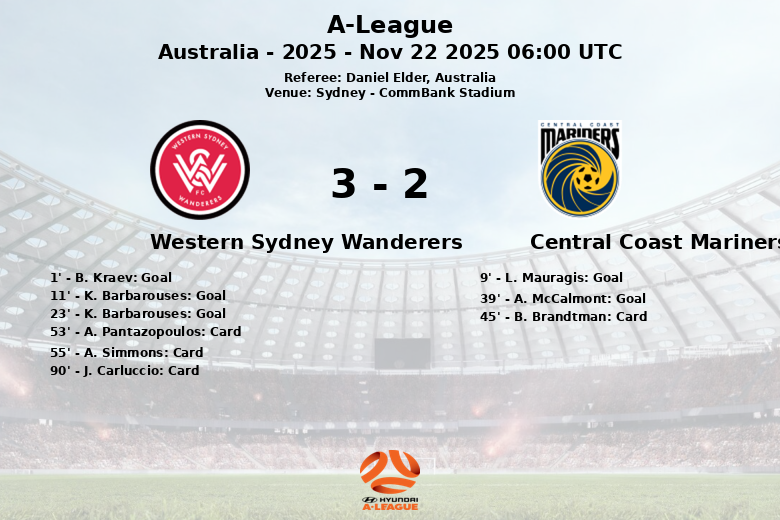 Sydney, Australia – En un encuentro electrizante disputado en el CommBank Stadium, el Western Sydney Wanderers se impuso al Central Coast Mariners en un partido vibrante de la A-League. El encuentro, que se llevó a cabo bajo la atenta mirada del árbitro Daniel Elder, terminó con un marcador final de Wanderers 3, Mariners 2.