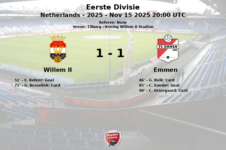 El Willem II dominó la posesión en un 48% y generó un total de 18 disparos, de los cuales 6 fueron a puerta. E. Kehrer abrió el marcador al minuto 51 con un gol tras asistencia de U. van Aalst. Sin embargo, el Emmen, con un 52% de posesión, respondió con tenacidad. A pesar de tener menos disparos (10 en total, con 3 a puerta), lograron capitalizar sus oportunidades. C. Sunder igualó el marcador en el minuto 85, sin asistencia.
